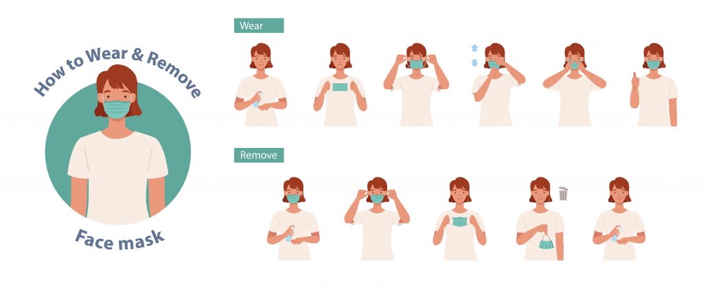 - indossare la mascherina toccando solo gli elastici o i legacci in particolar modo avendo cura di non toccare la parte interna;